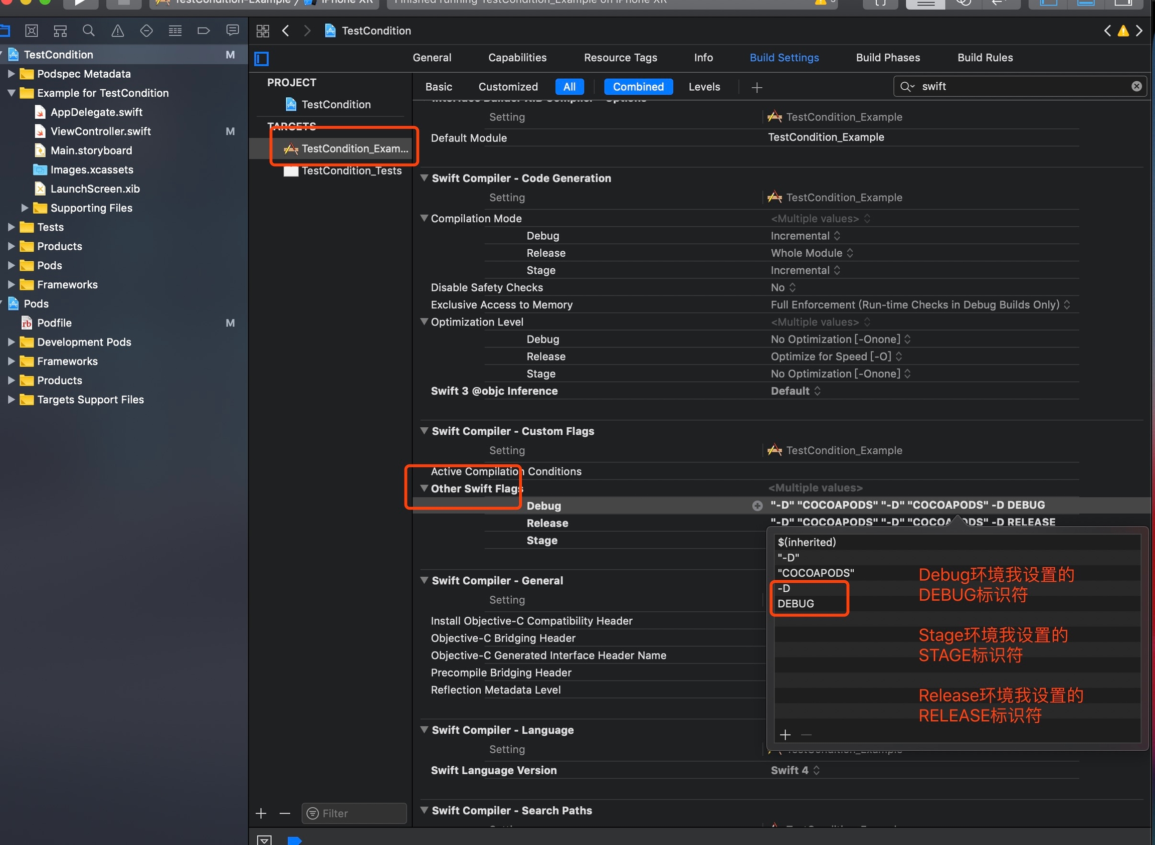 然后我们为我们的三种配置 添加他们各自的标识符 例如添加 DEBUG 为 Debug 配置, Swift Compiler - Custom Flags 选项卡 ,Other Swift Flags 这行 添加 "-D DEBUG"