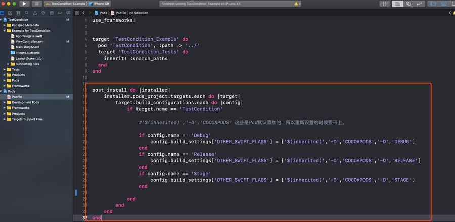 那么 Cocoapods 也提供了让你去设置的脚本函数,下面就是在 Podfile 文件里面加的脚本。 注意: 要加'$(inherited)','-D','COCOAPODS' 因为这是 CocoaPods 默认的带上的。