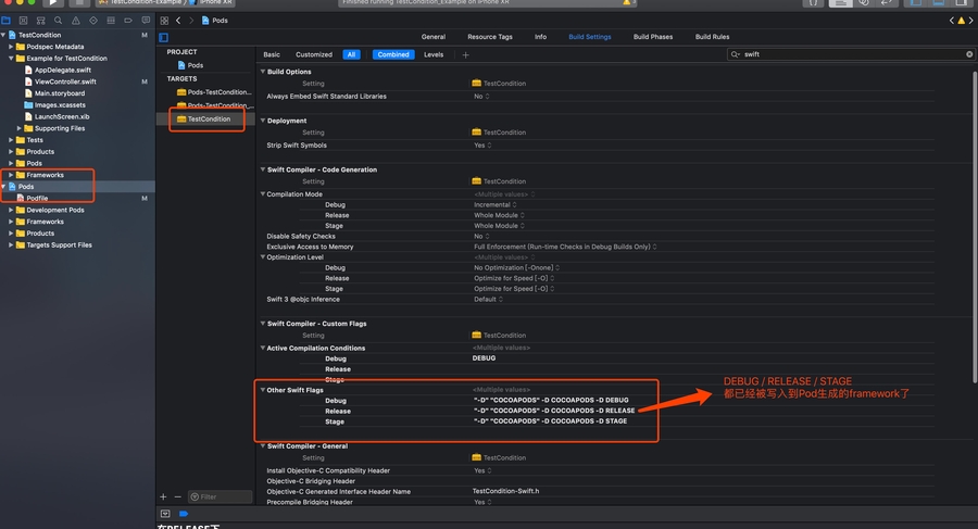 上面就是配置宏预处理的步骤,但是 Pod 在集成的时候会被变成一个 Framework,所以上面的设置需要在 Framework 里面再设置一遍才能对 Framework 里面的代码生效。