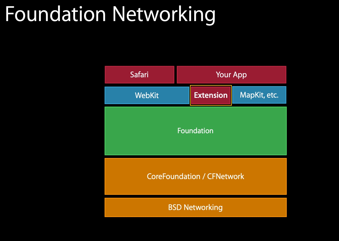 我们再看一张苹果 WWDC 介绍 Network 架构截图 从中可以看出,URLSession 和 URLConnection 是平级的,但是,你往下看我们验证的关系,似乎在 URLConnection 里面调用了 URLSession,否则为什么我们 Hook URLSession 的构造器,使用 URLConnection 的时候却走了这个方法。