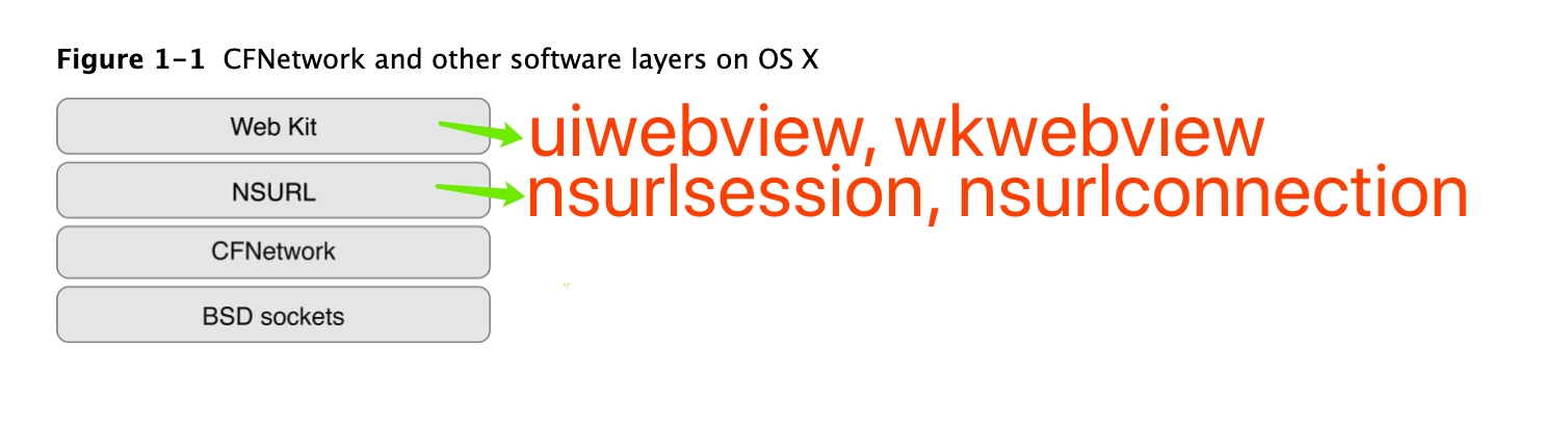 1.最上层: UIWebView 和 WKWebView 使用的 WebKit 封装的 NSURL(也就是封装的,NSURLSession,NSURLConnection)
