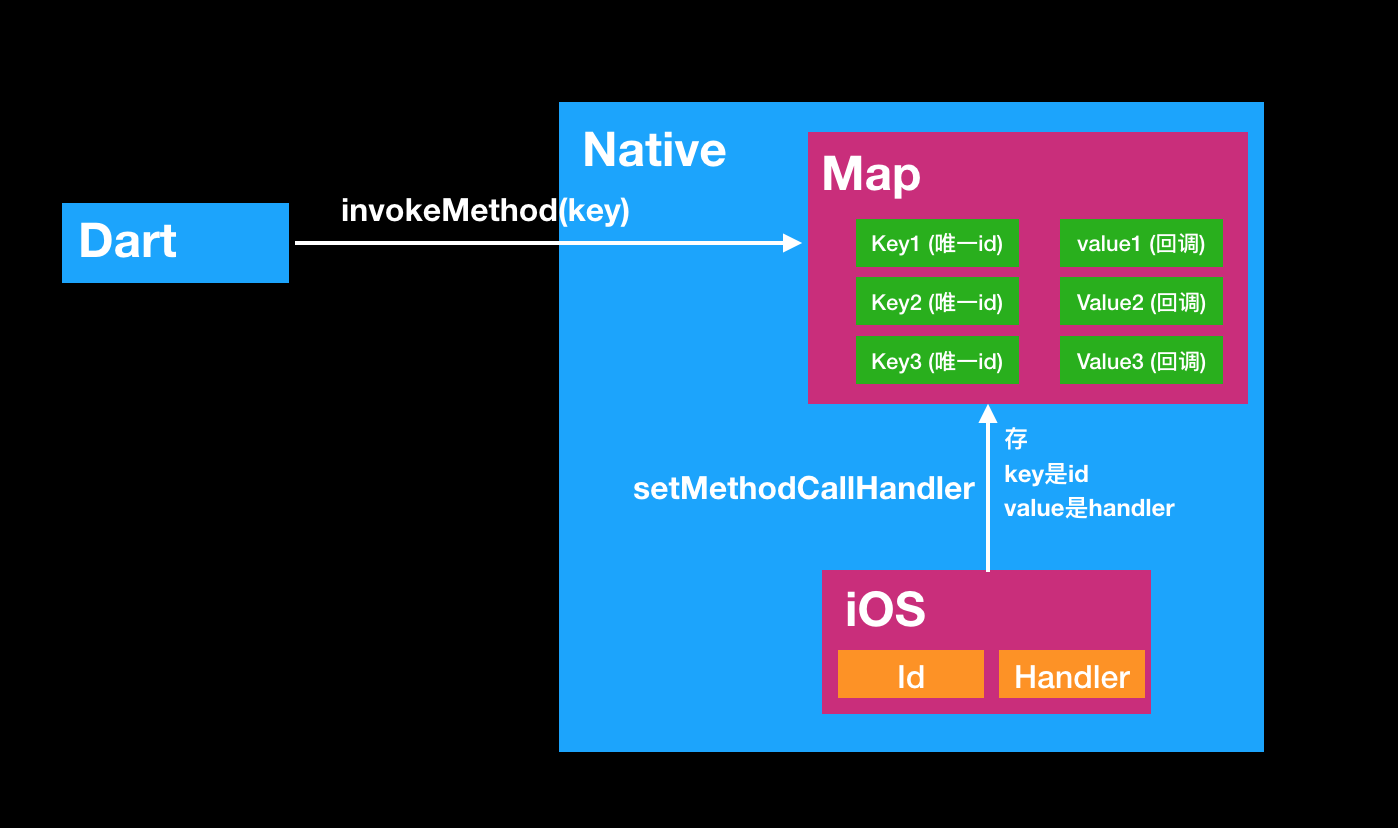 从上面来看哈,其实它的一个核心的工作原理,从 dart 端调用到 native 端,就是将 native 端的回调方法存在一个以那个 channel_id 为 key 的字典里,然后 dart 端执行 invokeMethod 的时候,通过那个 key 在 Map 里面找到回调方法 value,就是那个我们在 native 端实现的回调方法,然后执行它。 这其实 就是它的核心实现。
