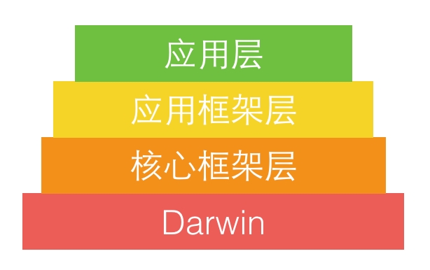 苹果官方将整个系统大致划分为上述 4 个层次: 应用层包括用户能接触到的图形应用,例如 Spotlight、Aqua、 SpringBoard 等。 应用框架层即开发人员接触到的 Cocoa 等框架。 核心框架层包括各种核心框架、OpenGL 等内容。 Darwin 即操作系统的核心,包括系统内核、驱动、Shell 等内容,这一层是开源的,其所有源码都可以在 opensource.apple.com 里找到。