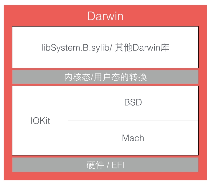 其中,在硬件层上面的三个组成部分:Mach、BSD、IOKit (还包括一些上面没标注的内容),共同组成了 XNU 内核。 XNU 内核的内环被称作 Mach,其作为一个微内核,仅提供了诸如处理器调度、IPC (进程间通信)等非常少量的基础服务。 BSD 层可以看作围绕 Mach 层的一个外环,其提供了诸如进程管理、文件系统和网络等功能。 IOKit 层是为设备驱动提供了一个面向对象(C++)的一个框架。