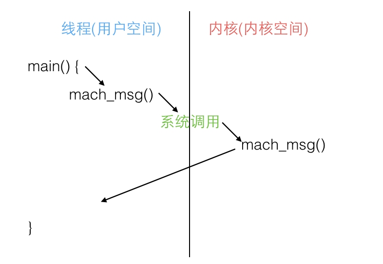 mach_port_name_t notify);为了实现消息的发送和接收,mach_msg() 函数实际上是调用了一个 Mach 陷阱 (trap),即函数 mach_msg_trap(),陷阱这个概念在 Mach 中等同于系统调用。当你在用户态调用 mach_msg_trap() 时会触发陷阱机制,切换到内核态;内核态中内核实现的 mach_msg() 函数会完成实际的工作,如下图: