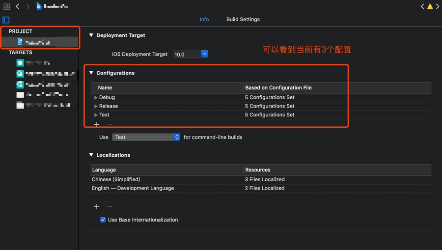 这是一个非常重要的选项,先说一个用到他的例子,一般项目都有各种环境,在同一个位置会有不同的行为,我们要怎么判断呢,Xcode 提供了一个 Project 级别的参数就是 BuildConfiguration,我们可以设置有 N 个BuildConfiguration,来在代码里面控制代码的不同行为,下面用个截图来看。