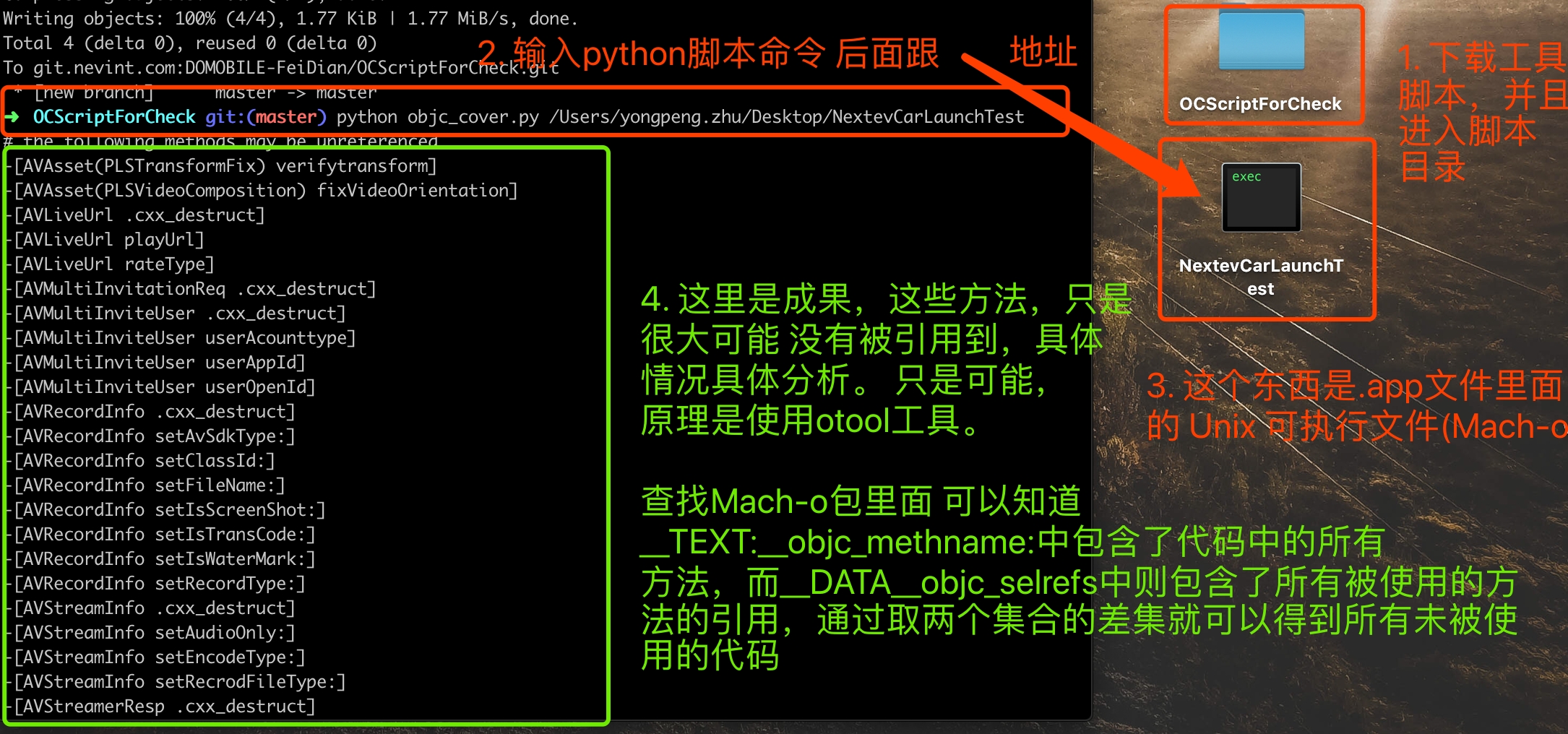 此脚本方法只能检测 OC 可能未使用的方法,不适用其他场景。python 依赖 otool 作为工具,原理利用 Mach-O 文件的结构和展示内容。